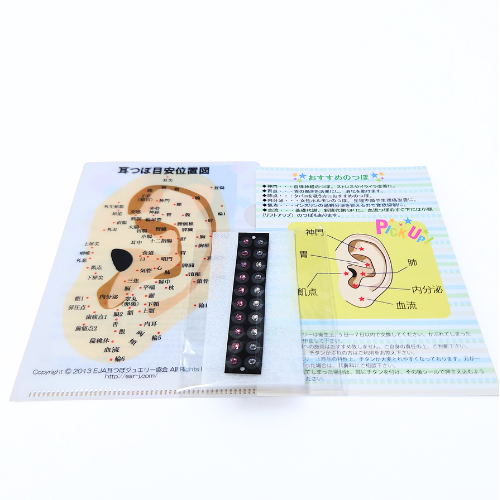 スワロフスキーのラインストーンがついた耳つぼジュエリー20粒! シンプルなクリスタルと定番人気の愛らしいピンク色(ライトローズ)の2色ミックス♪裏側の粒はチタン粒日本製。 チタン粒錆びにくく、汗や水に強い素材です。- 金属アレルギーを起こしにくい素材として知られています。 シール部分も薄く目立ちにくく肌に優しい日本製。 スワロフスキーのラインストーンは人気のss12 / 約3ミリサイズ。程よく耳に映える大きさです♪ 耳つぼの位置がわかる目安図が書かれたミニクリアファイルと、耳つぼの付け方がわかる簡単な説明書紙付き。 配送料250円でポストに投函できるネコポス配送もOK! ■端子部成分:チタン99.9%(内酸素0.1%) ■シール粘着部:アクリル系7mm ■日本製