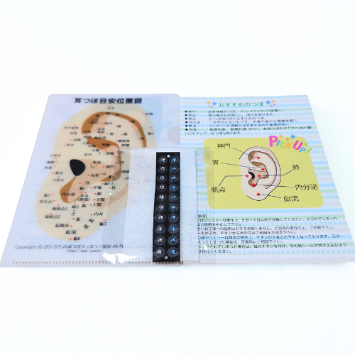 スワロフスキーのラインストーンがついた耳つぼジュエリー20粒! シンプルなクリスタルとさわやかな水色(アクアマリン)の2色ミックス♪裏側の粒はチタン粒日本製。 チタン粒錆びにくく、汗や水に強い素材です。- 金属アレルギーを起こしにくい素材として知られています。 シール部分も薄く目立ちにくく肌に優しい日本製。 スワロフスキーのラインストーンは人気のss12 / 約3ミリサイズ。程よく耳に映える大きさです♪ 耳つぼの位置がわかる目安図が書かれたミニクリアファイルと、耳つぼの付け方がわかる簡単な説明書紙付き。 配送料250円でポストに投函できるネコポス配送もOK! ■端子部成分:チタン99.9%(内酸素0.1%) ■シール粘着部:アクリル系7mm ■日本製