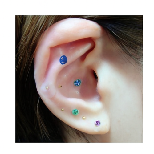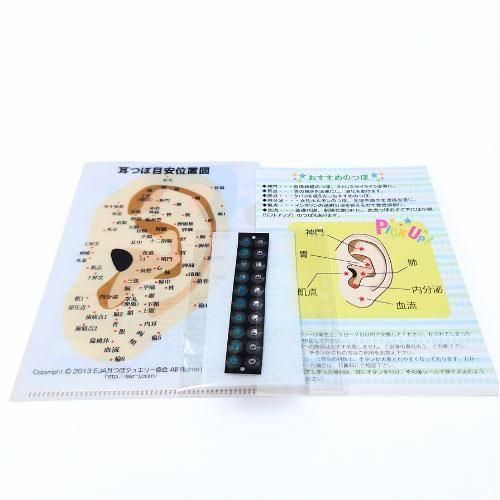 スワロフスキーのラインストーンがついた耳つぼジュエリー20粒! シンプルなクリスタルとグリーンにも見えるようなブルーにも見えるようなブルージルコンの2色ミックス♪裏側の粒はチタン粒日本製。 チタン粒錆びにくく、汗や水に強い素材です。- 金属アレルギーを起こしにくい素材として知られています。 シール部分も薄く目立ちにくく肌に優しい日本製。 スワロフスキーのラインストーンは人気のss12 / 約3ミリサイズ。程よく耳に映える大きさです♪ 耳つぼの位置がわかる目安図が書かれたミニクリアファイルと、耳つぼの付け方がわかる簡単な説明書紙付き。 配送料250円でポストに投函できるネコポス配送もOK! ■端子部成分:チタン99.9%(内酸素0.1%) ■シール粘着部:アクリル系7mm ■日本製
